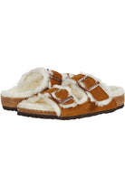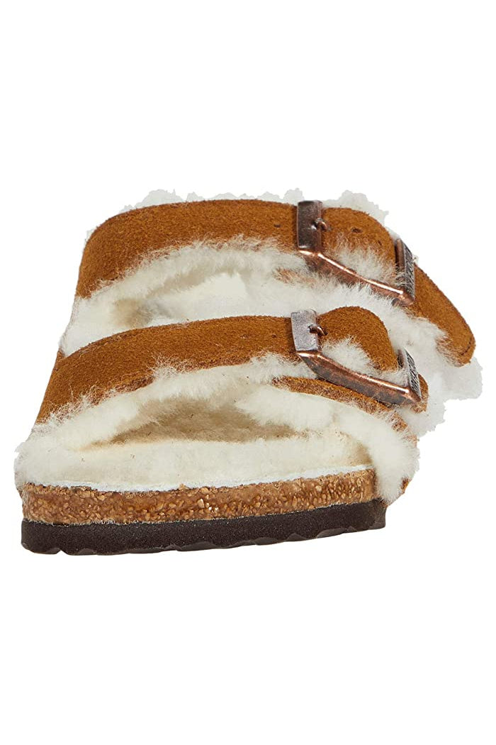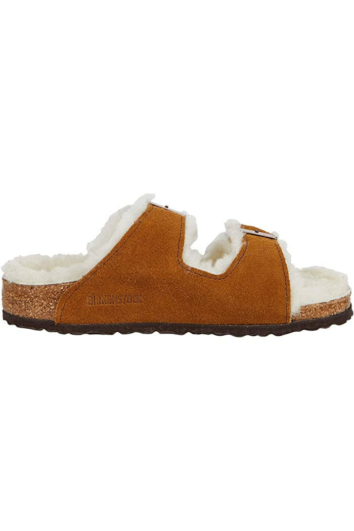 The popular BIRKENSTOCK Arizona is a classic model with two adjustable straps. Featured in genuine high-quality suede – and is now available in an extra cozy version thanks to a soft, bright genuine shearling lining on the anatomically formed cork-latex footbed and straps. These sandals are perfect for chilly, winter evenings.
