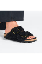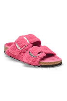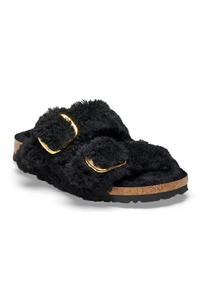 Plush it up. Oh-so-fluffy teddy shearling and oversized statement buckles transform the Arizona's iconic, two-strap design into the season's be-seen style. Teddy shearling even pads the footbed lining for the ultimate cozy finish. Complete with classic BIRKENSTOCK design elements, like a contoured cork-latex footbed that shapes to you with wear.