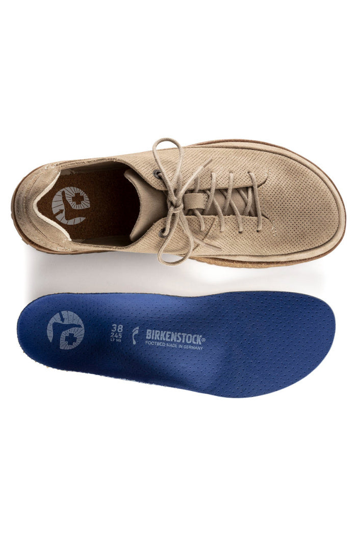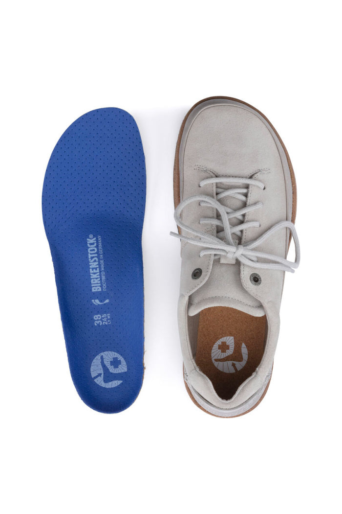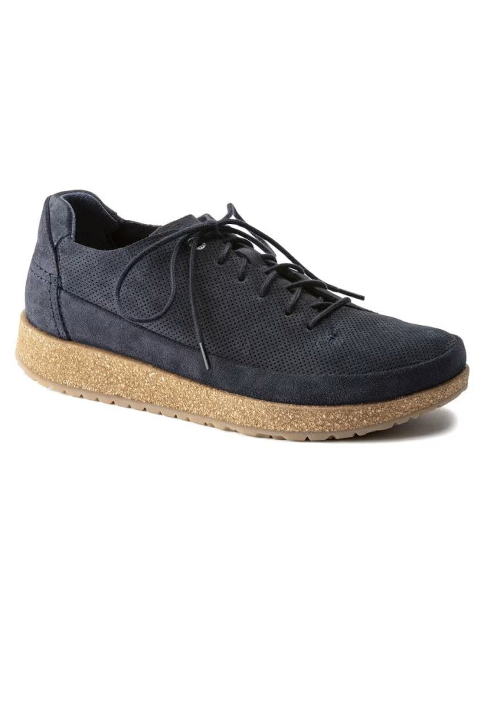 Introducing the BIRKENSTOCK Honnef - our newest street smart shoe engineered completely around our new Deep Blue footbed. The four part footbed includes a moisture wicking microfiber liner, cork and jute layers for optimum arch support and a PU base for added shock absorption and forefoot cushioning. The sporty lace up style is perfect for your most active days whether that’s all day around town or on your next travel adventure. The upper is made of perforated suede.