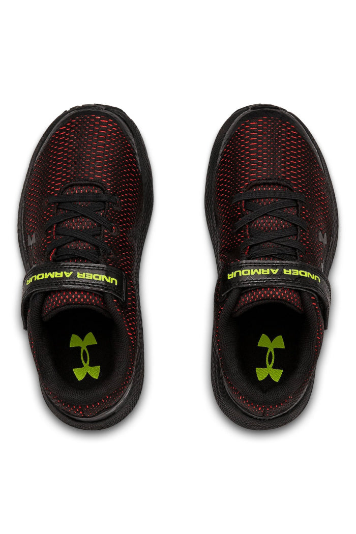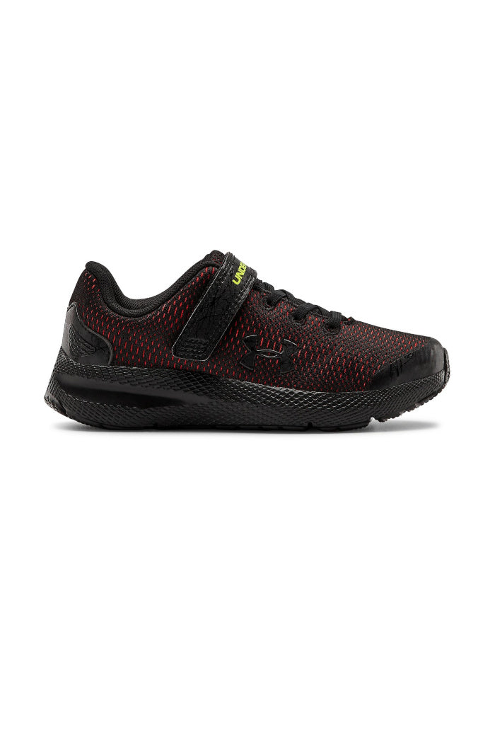 rugged velcro children's sneakers in black and red featuring no tie shoe lacesUA Micro G® cushioning is incredibly snappy and responsive. Add on a breathable, lightweight textile upper and you've got a shoe built for speed. All you need to do is get after it.
