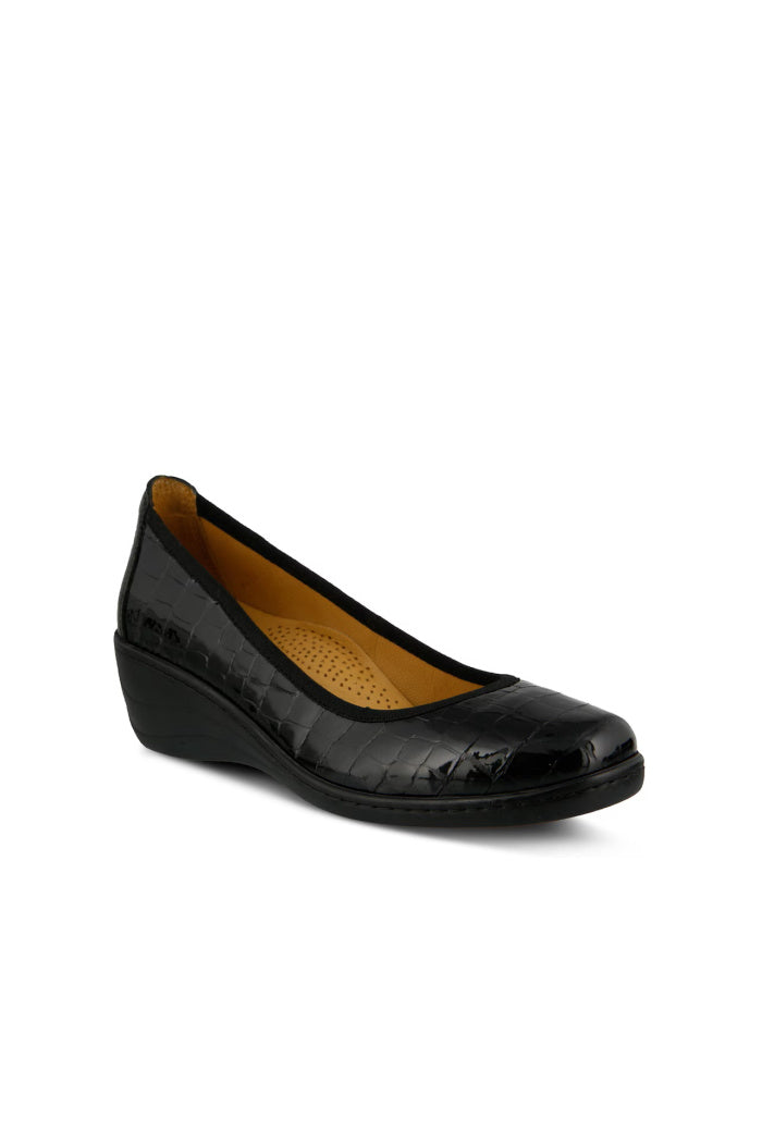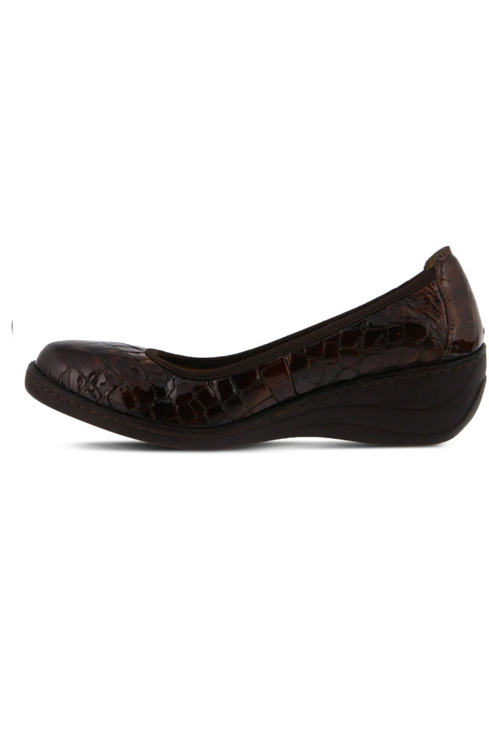Croco embossed patent leather wedge ballerina with elasticized topline.