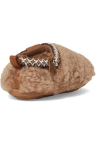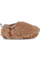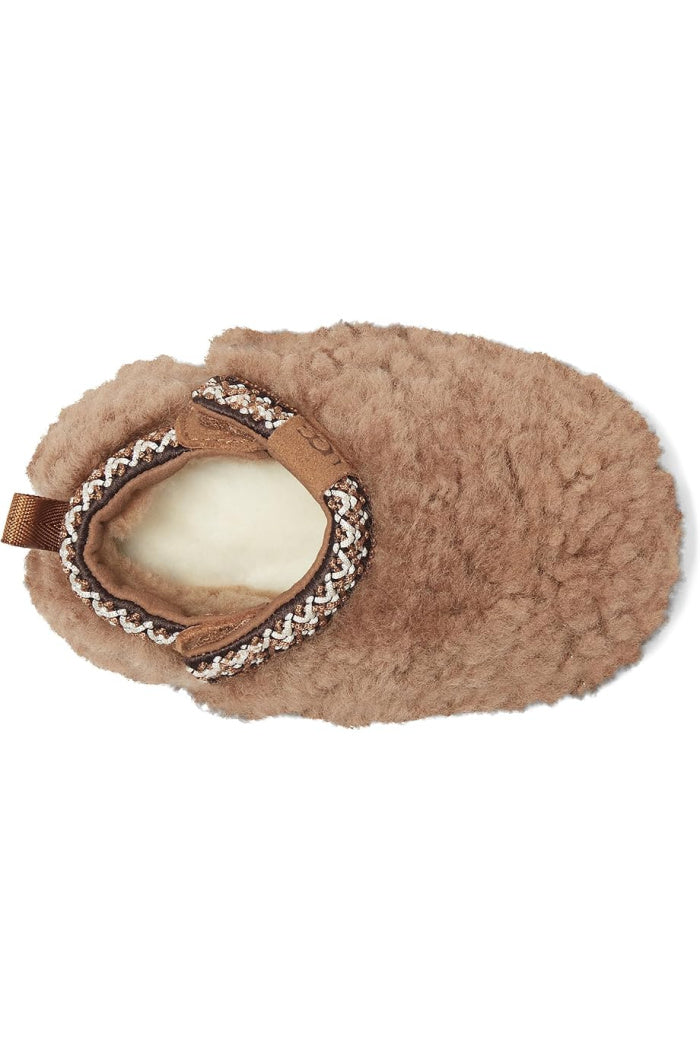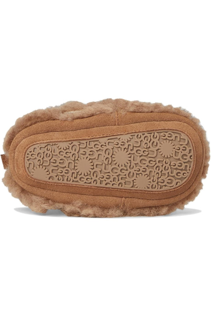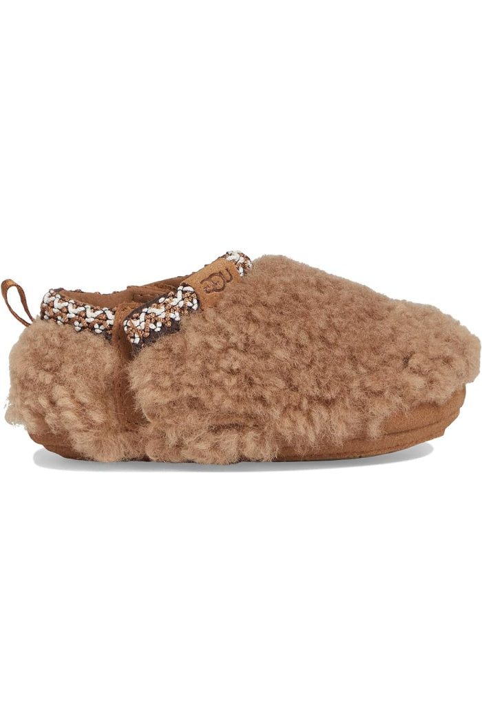 The UGG® Kids Baby Tasman Maxi Curly slippers just got the cutest, curliest update. Featuring a curly sheepskin upper, a suede mudguard, and a hook-and-loop closure, your baby can take the feeling of UGG® from crawling through naptime. Their UGGbraid is made with 100% recycled polyester fibers, while the UGGplush lining is crafted from 60% upcycled wool and 40% TENCEL™ Lyocell®. These slip-on sandals feature a wool insole and a collar lining with a peppermint-based odor-removing treatment, keeping your kid's feet warm and fresh. They are designed to match the adult-sized version so that you can have a perfect matching family look.
