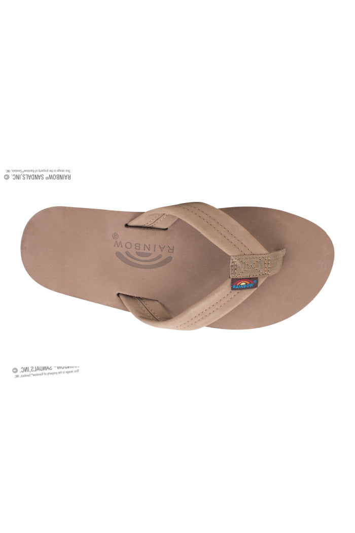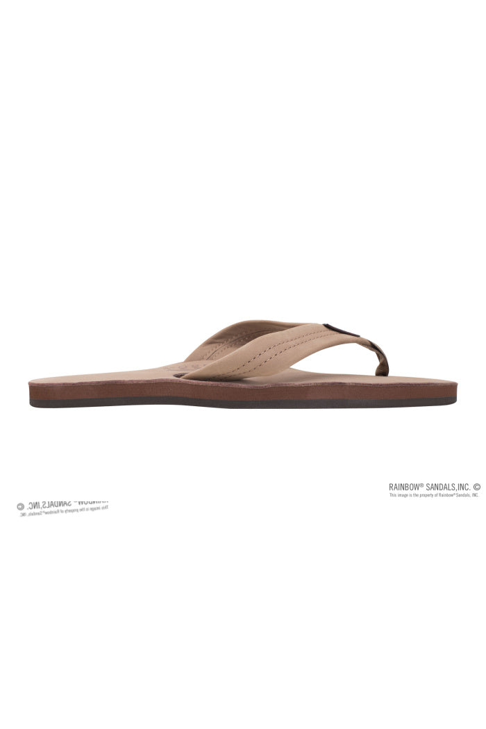 The single layer premier leather sandal is made with top grade nubuck leather; the top sole is embossed with the Rainbow® logo. The strap, also nubuck leather; is double stitched, and the nylon toe piece is secured with a box X stitch, all using bonded nylon thread.