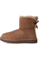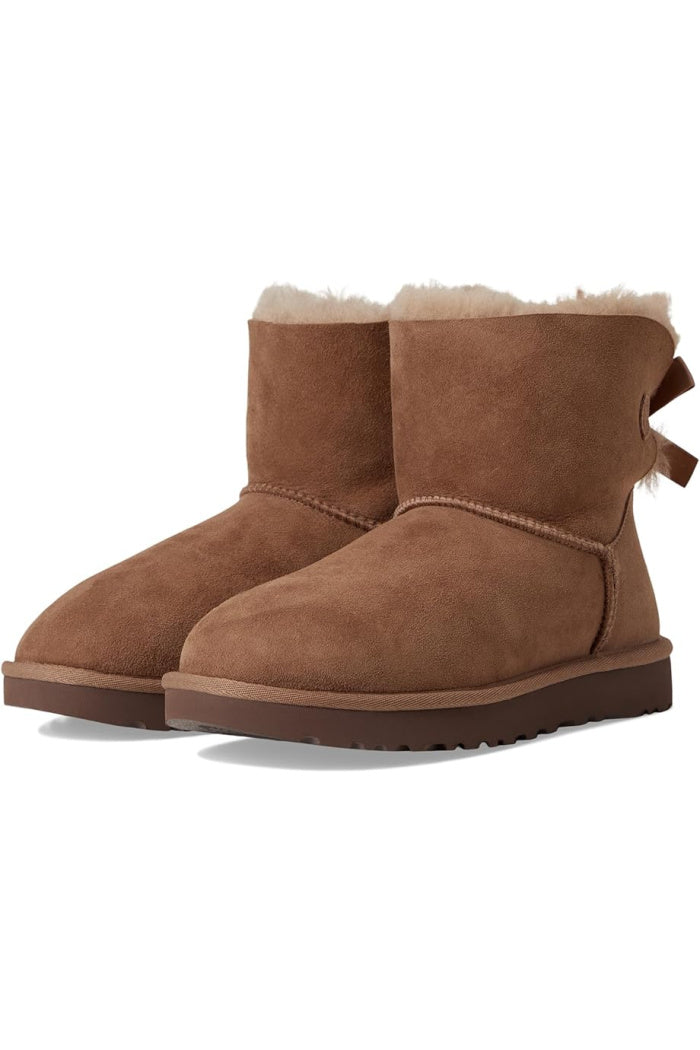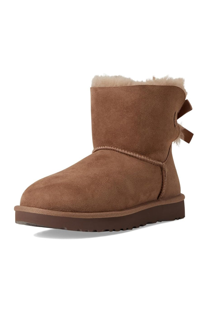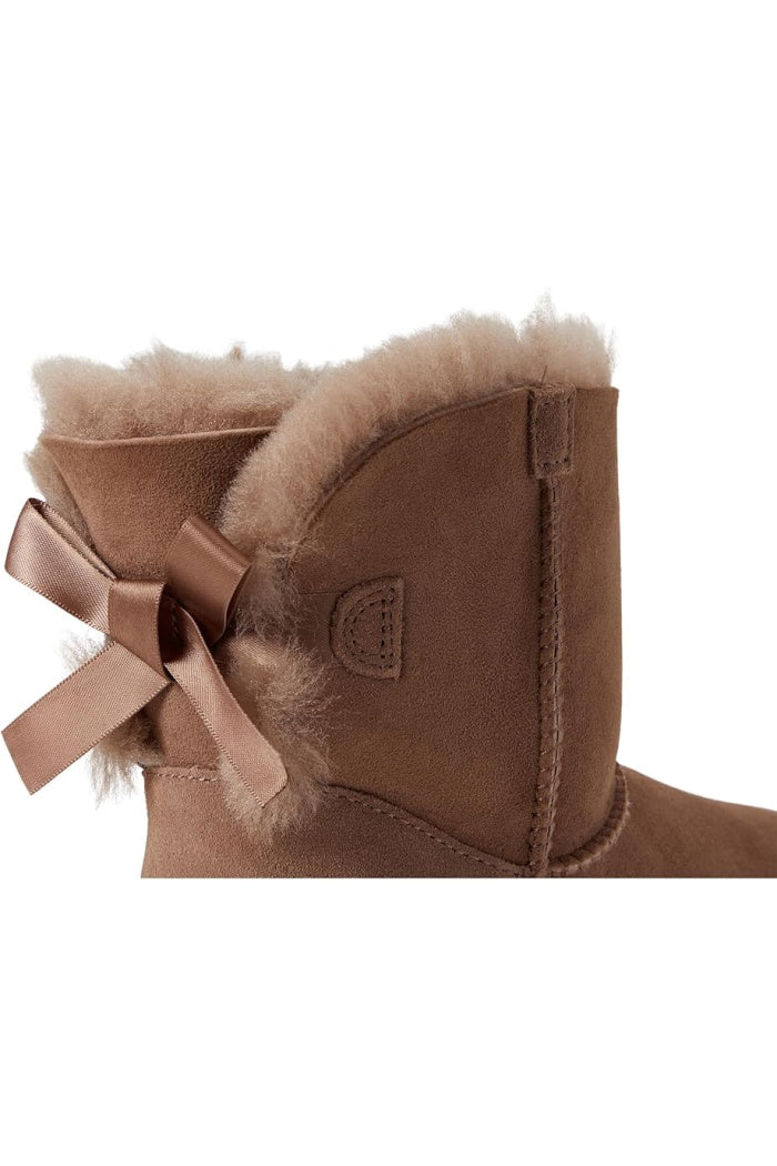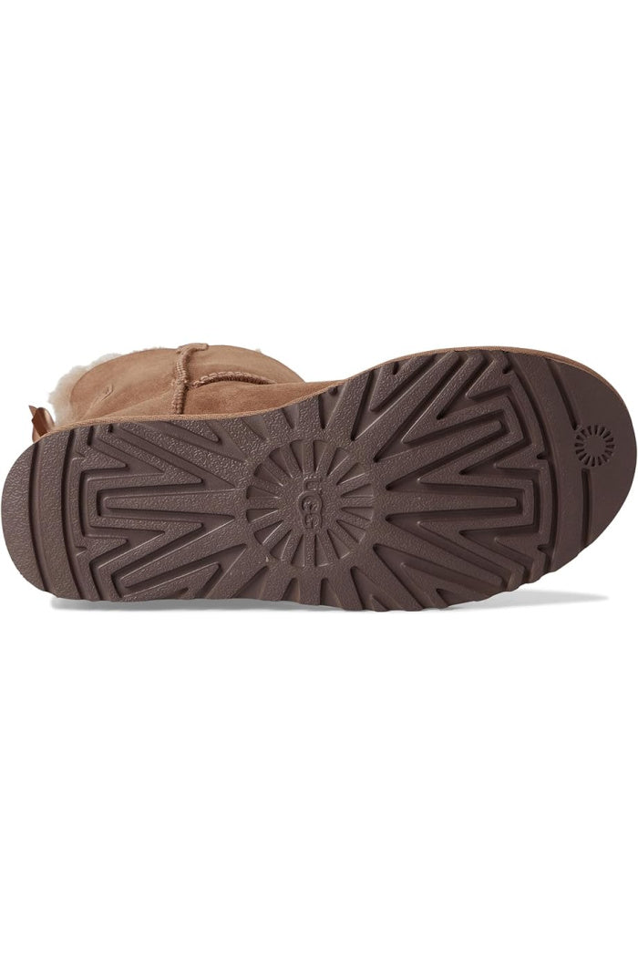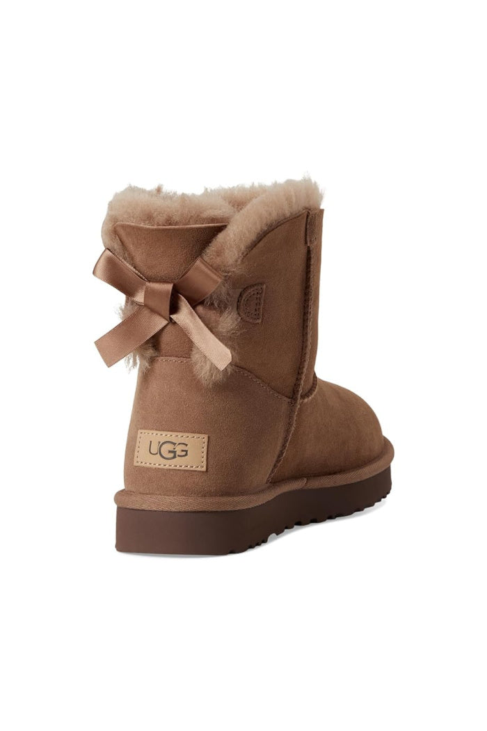 Keep warm and look good in the UGG® Mini Bailey Bow II ankle boot; crafted from pretreated Twinface sheepskin and suede upper topped with a satin bow for added appeal.