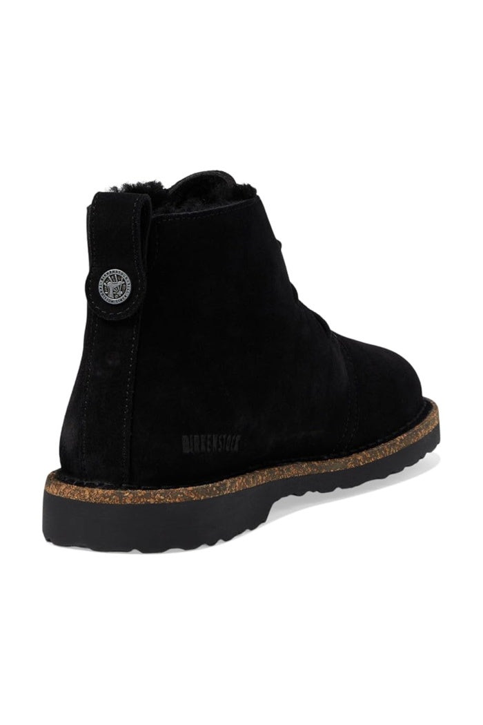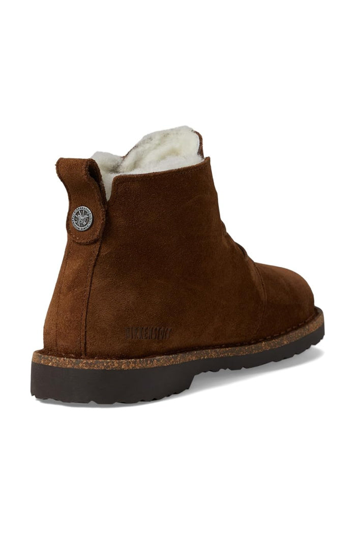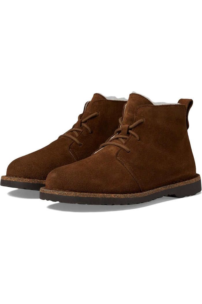 This stylish new chukka boot, from Birkenstock®, features a shearling lining for cozy comfort. These lace-up closure boots come in a round toe silhouette, crafted from a suede upper and a cork footbed covered with a layer of warm, comfy shearling.